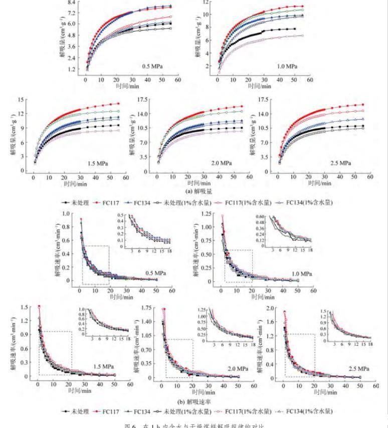 通過(guò)對(duì)干燥與含水煤樣解吸量和解吸速率的分析,經(jīng)過(guò)氣潤(rùn)濕反轉(zhuǎn)劑——FC117和FC134處理后的煤樣解吸量和解吸速率均有所提升,其中FC117的效果更加顯著。同時(shí),經(jīng)過(guò)表面活性劑處理后,煤樣的潤(rùn)濕性發(fā)生轉(zhuǎn)變,水鎖效應(yīng)得到緩解和消除。含水煤樣的解吸量和解吸速率也均大于未處理的干燥煤樣。定量地分析了表面活性劑改變煤體表面潤(rùn)濕性,由親水性向疏水性轉(zhuǎn)變,緩解水鎖損害,進(jìn)而增加煤樣解吸量。