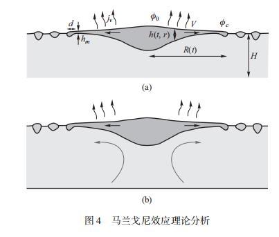 馬蘭戈尼效應(yīng)是指由于表面張力不同的二種液體的界面存在表面張力梯度而使質(zhì)量傳送的現(xiàn)象。出現(xiàn)馬蘭戈尼效應(yīng)的原因是表面張力大的液體對(duì)其周圍表面張力小的液體的拉力強(qiáng),產(chǎn)生表面張力梯度;使液體從表面張力低的方向向表面張力高的方向流動(dòng)。此時(shí)引入馬蘭戈尼效應(yīng),就是對(duì)前文所說(shuō)理論的一個(gè)形象簡(jiǎn)潔的概括。當(dāng)酒精濃度超過(guò)某一閾值,液滴擴(kuò)散。酒精蒸發(fā)液滴外圍較薄的區(qū)域變得富含水,當(dāng)外圍局部濃度小于閾值,擴(kuò)散停止??臻g上不均勻的混合物濃度產(chǎn)生沿液滴半徑的表面張力梯度,它們將溶質(zhì)從油滴中心向外驅(qū)動(dòng)。蒸發(fā)優(yōu)先消耗位于邊緣附近的液滴最薄部分的酒精,而乙醇含量的變化導(dǎo)致朝向液滴邊緣的界面張力增加。這些梯度會(huì)在混合空氣和混合油界面處產(chǎn)生馬蘭戈尼切向應(yīng)力,從而驅(qū)動(dòng)從液滴中心到外圍的徑向流動(dòng)。液滴邊緣脫濕和向外的馬蘭戈尼流動(dòng)效應(yīng)的結(jié)合導(dǎo)致液滴的外圍形成較厚的邊緣,從而變得不穩(wěn)定,分裂成無(wú)數(shù)的小液滴,產(chǎn)生液滴爆炸的物理現(xiàn)象。馬蘭戈尼效應(yīng)示意圖如圖4所示,黑箭頭代表蒸發(fā)量和厚度的徑向減小,灰色箭頭代表液滴中馬蘭戈尼應(yīng)力與油層中的黏性應(yīng)力平衡,導(dǎo)致大量流動(dòng)。h(r,t)是液滴的厚度剖面,R(t)是中心液滴的半徑,H是油面厚度。