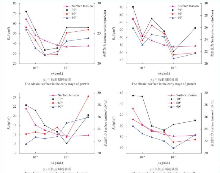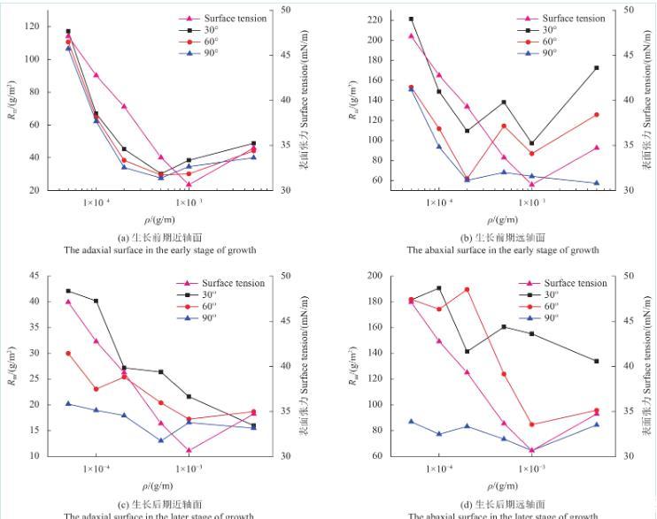 圖5為不同質(zhì)量濃度Triton X-100溶液在蘋果葉片近、遠(yuǎn)軸面的Rm變化規(guī)律。從中可以看出,不同傾角下蘋果葉片生長前期近、遠(yuǎn)軸面的Rm值和表面張力均隨溶液質(zhì)量濃度的升高而不斷減小,當(dāng)Triton X-100溶液質(zhì)量濃度達(dá)到cmc時,近軸面Rm值與表面張力的變化趨于平緩,而遠(yuǎn)軸面的Rm值則出現(xiàn)大幅波動。其原因可能與Triton X-100表面活性效率高(cmc=1.32×10?4 g/mL)有關(guān),同時溶液色散分量占比會隨溶液質(zhì)量濃度的升高而提高,而對蘋果葉片遠(yuǎn)軸面表面自由能起主導(dǎo)作用的也是色散分量,以上多重因素導(dǎo)致遠(yuǎn)軸面的Rm值產(chǎn)生波動。蘋果葉片生長后期Rm與表面張力隨溶液質(zhì)量濃度的變化與生長前期相似。