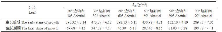 以上結(jié)果表明,蘋果葉片生長前期近軸面的Rm值高于生長后期,且在同一生長期,蘋果葉片遠(yuǎn)軸面的Rm值遠(yuǎn)高于近軸面。此外,蘋果葉片的Rm值隨葉傾角的增大而減小。