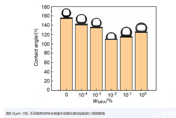 接觸角測量可以用來表征納米顆粒經(jīng)改性后的親疏水性。本研究是以氧化鋁板作為模擬納米氧化鋁的基材,研究癸烷油滴在不同MPA濃度的溶液中(pH=7)在氧化鋁板上的三相接觸角,如圖6所示。當MPA濃度為0時,油滴與氧化鋁板的接觸角超過150°,說明氧化鋁在沒有MPA分子時具有較強的親水性。隨著MPA濃度逐漸增加,接觸角不斷降低,這是因為MPA濃度越高,在氧化鋁板上吸附的MPA分子越多,疏水性越強,油滴則可更容易吸附在界面上,當MPA濃度為0.01%(w)時,接觸角降到最低(110°)。然而,當進一步增加MPA濃度,接觸角反而逐漸升高,這是因為過多的Bola型分子結(jié)構(gòu)MPA使親水性反而增加。該結(jié)果與Zeta電勢的結(jié)果趨勢類似,可以進一步印證了MPA分子吸附在了納米Al2O3顆粒表面上。
