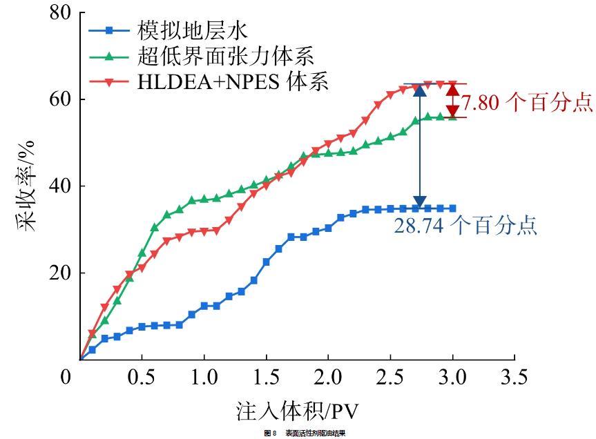 通過(guò)巖心動(dòng)態(tài)驅(qū)替實(shí)驗(yàn),評(píng)價(jià)了HLDEA+NPES體系的提高采收率性能,并與超低界面張力體系進(jìn)行了對(duì)比,實(shí)驗(yàn)結(jié)果如圖8所示。HLDEA+NPES體系采收率為63.60%,超低界面張力體系采收率為55.80%,模擬地層水采收率為34.90%,在水驅(qū)基礎(chǔ)上提高了28.74個(gè)百分點(diǎn),在超低界面張力體系驅(qū)基礎(chǔ)上提高了7.80個(gè)百分點(diǎn)。實(shí)驗(yàn)結(jié)果表明,體系的低界面張力性能與強(qiáng)油固界面潤(rùn)濕調(diào)控性能之間存在較強(qiáng)的協(xié)同作用。通過(guò)油固界面作用將油滴剝離,并脫離表面;在低界面張力作用下促使剝離油滴變形從而運(yùn)移出孔隙,能夠最為有效地采出巖心中的原油。