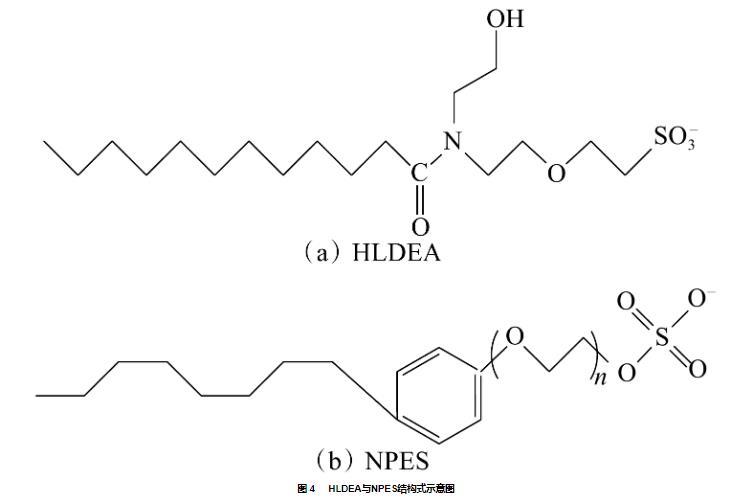 將配制好的穩(wěn)定性優(yōu)異的復(fù)配體系[0.15%(w)HLDEA+0.15%(w)助表面活性劑]置于75℃條件下,測(cè)定復(fù)配體系的油水界面張力,結(jié)果見(jiàn)圖3。由圖3可得,復(fù)配后體系油水界面張力隨時(shí)間均出現(xiàn)先下降后基本保持平衡的趨勢(shì)。HLDEA與兩種陰非離子型表面活性劑APEC-4Na和NPES復(fù)配后體系的油水界面張力降低至接近超低界面張力水平(10?3 mN·m?1)。這是因?yàn)镠LDEA分子小、親油性高,其擴(kuò)散速度快且傾向于進(jìn)入油滴內(nèi)部,同時(shí),溶液中的NPES分子隨時(shí)間推移逐步被吸引于油水界面,尾鏈與HLDEA分子相互糾纏形成緊密結(jié)構(gòu),提高了油水界面吸附膜的致密程度,從而使界面張力大幅降低。最終優(yōu)選出的助表面活性劑為NPES,在與HLDEA復(fù)配后體系界面張力值為3.8×10?3 mN/m。HLDEA與NPES結(jié)構(gòu)式見(jiàn)圖4。作為對(duì)比的超低界面張力體系油水界面張力值為2.9×10?4 mN/m,較HLDEA+NPES體系界面張力低了一個(gè)數(shù)量級(jí)。