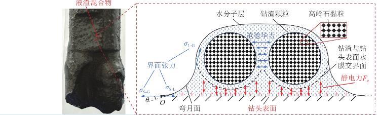 式(1)表明,包裹鉆渣顆粒的“水膜”與鉆頭表面“水膜”形成的整體受彎月面處界面張力作用,被不斷沿鉆頭表面方向“拉扯”,使鉆渣顆粒被界面張力“綁縛”于鉆頭表面(圖3)。但僅依靠界面張力顯然無法抵抗鉆具高速旋轉(zhuǎn)產(chǎn)生的離心力,靜電力與界面張力的共同作用導(dǎo)致了泥化鉆渣黏附于鉆具表面,且靜電力對液渣混合物的黏附發(fā)揮了重要作用。
