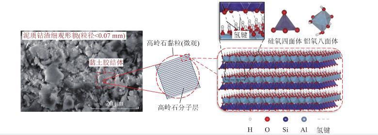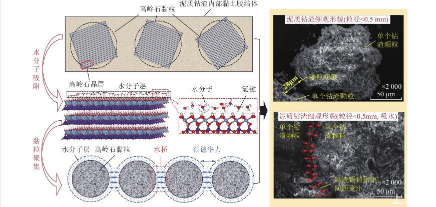 圖2中,在微觀尺度層面,由于高嶺石形成過程中發(fā)生同晶置換,使晶層表面帶永久負(fù)電荷。當(dāng)高嶺石黏粒遇水時,水分子的偶極性使氫原子易與高嶺石晶層表面電負(fù)性較強的氧原子結(jié)合形成氫鍵,同時,吸附在晶層表面的水分子之間也會通過氫鍵連接,該過程即為水分子的吸附過程。當(dāng)?shù)?層水分子被高嶺石黏粒吸附后,其外側(cè)氧原子呈負(fù)電性,繼續(xù)與第2層水分子的氫原子以氫鍵形式結(jié)合,最終形成多層水分子“水膜”。高嶺石黏粒不斷吸水?dāng)U層,使鉆渣顆粒體積不斷膨脹,同時伴隨鉆渣內(nèi)部非泥質(zhì)礦物的溶解,高嶺石黏粒間距變小,并通過外側(cè)“水膜”相互吸附,構(gòu)成“水橋”,使得多個高嶺石黏粒能夠在遇水后聚集,形成更大的團聚體。