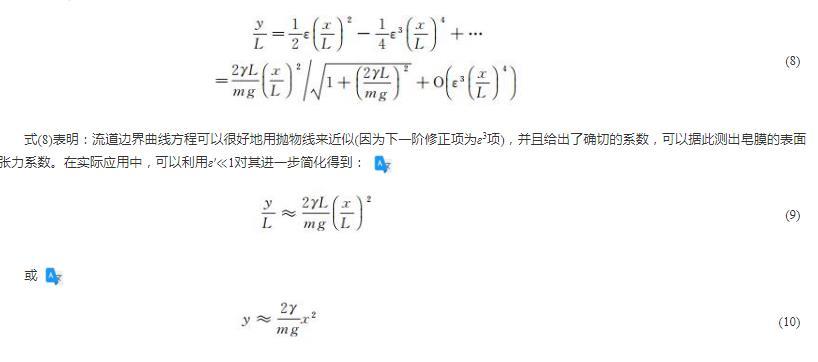 Sane等推導(dǎo)了表面張力系數(shù)與尼龍繩曲線方程的關(guān)系,但并未獲得曲線方程的精確解,而是采用高階多項(xiàng)式對(duì)實(shí)測(cè)曲線進(jìn)行擬合,發(fā)現(xiàn)選取二階多項(xiàng)式可以得到較好的結(jié)果,從而也獲得了式(10),并通過(guò)擬合系數(shù)得到了表面張力系數(shù)。本文的嚴(yán)格推導(dǎo)說(shuō)明:流道邊界曲線是拋物線加上高兩階小量的修正。圖(2)也證明了這一推導(dǎo)結(jié)論的正確性。