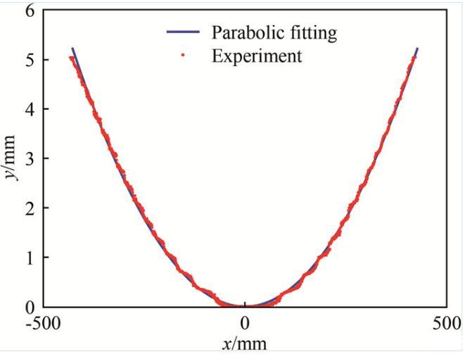為驗(yàn)證曲線方程(10),在砝碼質(zhì)量m=0.2 kg、皂液流量Q=35 mL/min時(shí),實(shí)測(cè)了穩(wěn)態(tài)流動(dòng)皂膜狀態(tài)下尼龍繩的位置坐標(biāo),如圖2中的離散點(diǎn)所示。尼龍繩位置通過(guò)照相得到,為獲得較大范圍內(nèi)的圖像,采用的放大倍數(shù)為1個(gè)像素對(duì)應(yīng)0.35 mm的物理尺寸。對(duì)尼龍繩圖像在水平方向的光強(qiáng)分布進(jìn)行高斯函數(shù)擬合以獲得亞像素的定位精度。圖2中的光滑曲線是采用式(10)進(jìn)行擬合的結(jié)果,與實(shí)測(cè)曲線吻合良好,驗(yàn)證了分析的正確性。利用已知的砝碼質(zhì)量,可以進(jìn)一步得到表面張力系數(shù)γ=27.5 mN/m。值得注意的是:當(dāng)砝碼質(zhì)量很小時(shí),表面張力引起的流道收縮很大(在中點(diǎn)O處達(dá)到最大值12%),為避免由此帶來(lái)的流速和厚度場(chǎng)改變,在流動(dòng)皂膜實(shí)驗(yàn)中一般使用m=2 kg的砝碼。