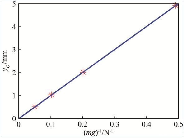 圖3給出了在同一皂液流量Q=35 mL/min下測(cè)得的流道中點(diǎn)O的位移隨砝碼質(zhì)量的變化以及根據(jù)式(11)擬合的直線。所有數(shù)據(jù)點(diǎn)都很好地落在過(guò)原點(diǎn)的擬合直線上,進(jìn)一步驗(yàn)證了本文推導(dǎo)的正確性。根據(jù)直線斜率測(cè)得的表面張力系數(shù)γ=27.1 mN/m,與前述拋物線擬合法得到的結(jié)果相近。
