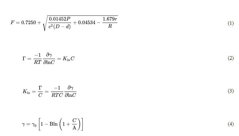 實(shí)際表面張力(γ)由儀器表面張力讀數(shù)(P)、校正因子(F)和實(shí)驗(yàn)相關(guān)常數(shù)相乘得到。校正因子計(jì)算如公式(1)所示;氣-水界面吸附系數(shù)通過(guò)Gibbs吸附等溫方程得到,見公式(2)和公式(3);將Szyszkowski方程應(yīng)用于表面張力數(shù)據(jù),見公式(4),該方程提供了一種計(jì)算數(shù)值的統(tǒng)一方法。