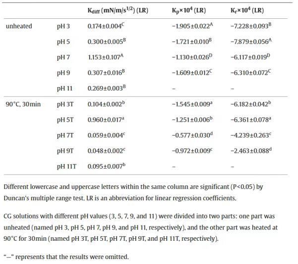 Kdiff、Kp和Kr的最高值分別為pH值7、3和5。柔性蛋白可以在油水界面上更快地吸附和重新排列。pH為3時CG靈活的二級結(jié)構(gòu),使其具有更好的吸附動力學(xué),。pH 5(接近pI 4.3)的CG更弱的靜電斥力,引起了更好的結(jié)構(gòu)重排。加熱后,除pH值為5時CG的Kdiff外,所有樣品的Kdiff、Kp和Kr均有所下降。加熱后的CG具有較低的初始界面張力和較短的平衡吸附時間(圖1a),它能迅速達(dá)到平衡狀態(tài),并且吸附動力學(xué)指數(shù)較低。此外,加熱后的CG表現(xiàn)出顯著的變性和聚集,殘留的蛋白質(zhì)分子會產(chǎn)生空間位阻,從而阻礙聚集后的CG到達(dá)油水界面。此外,不溶性CG聚集體對殘留CG分子的吸附產(chǎn)生了屏障。CG在pH為5時,蛋白質(zhì)形成大量沉淀,溶解度僅為12.05%。可溶性蛋白含量低意味著較弱的靜電排斥力,這使剩余的蛋白更容易擴(kuò)散,從而導(dǎo)致最高的Kdiff。與動態(tài)界面張力相比,CG與pH 5T的吸附動力學(xué)不受蛋白質(zhì)濃度的影響。