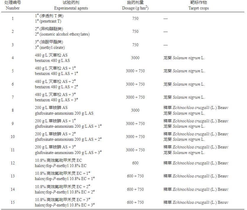 植物葉片性質(zhì)的不同會(huì)影響藥液的潤濕和持留能力。接觸角測定結(jié)果(表3)顯示:無論靶標(biāo)作物是禾本科的稗草還是闊葉科的龍葵,2#增效劑的接觸角均最小,且3種除草劑中添加2#增效劑后接觸角減小的程度最大(6,10,14),添加3#增效劑后接觸角減小的程度最小,因此,2#增效劑減小接觸角的性能最好。