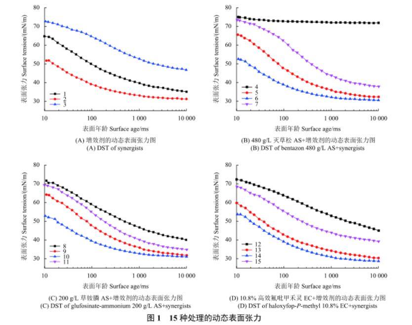 測定結(jié)果如圖1(A)所示:處理2降低表面張力的速度最快,且在10 000 ms時(shí)表面張力達(dá)到最小值,處理3降低表面張力的速度最慢,說明2#增效劑的效果最好,3#增效劑最差。與未添加增效劑的處理(4,8,12)相比,添加增效劑后除草劑表面張力的降低速度更快,10 000 ms時(shí)所達(dá)到的靜態(tài)表面張力值也更小,其中也是2#增效劑的效果最好。