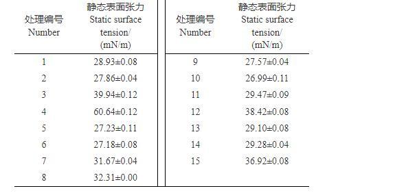 1.2.1靜態(tài)表面張力測定參照文獻(xiàn)方法測定。在(25±1)℃下,用0.3 mm的鉑金環(huán)(外徑20.30 mm,周長61.89 mm,密度0.998 g/mL)在全自動(dòng)張力儀上先用純水進(jìn)行校準(zhǔn),然后測定表1中15種處理的靜態(tài)表面張力,每個(gè)試驗(yàn)至少重復(fù)3次,結(jié)果取平均值,用Origin Pro軟件(9.0版,OriginLab公司)處理數(shù)據(jù)。