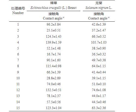 表3 15種處理作用于靶標(biāo)作物時(shí)的接觸角
