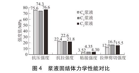 3種漿液固結(jié)體力學(xué)性能對比見圖4。由圖4可以看出:3種漿液固結(jié)體抗壓強度和抗拉強度數(shù)值差別不大,說明表面活性劑對漿液固結(jié)體的抗壓強度和抗拉強度無影響。但C1、C2漿液的粘接強度和拉伸剪切強度明顯高于C0漿液的粘接強度和拉伸剪切強度。其中C1漿液的粘接強度和拉伸剪切強度比C0漿液分別提高了23.6%和37.5%;C2漿液的粘接強度和拉伸剪切強度比C0漿液分別提高了22.2%和29.2%。其原因在于表面活性劑的加入降低了漿液的接觸角,使?jié){液有更好的浸潤性和潤濕性,從而提高了漿液的粘接強度和拉伸剪切強度。