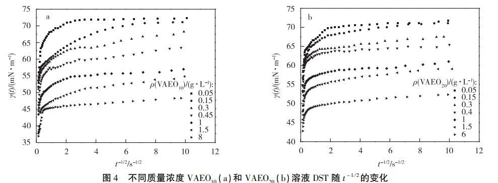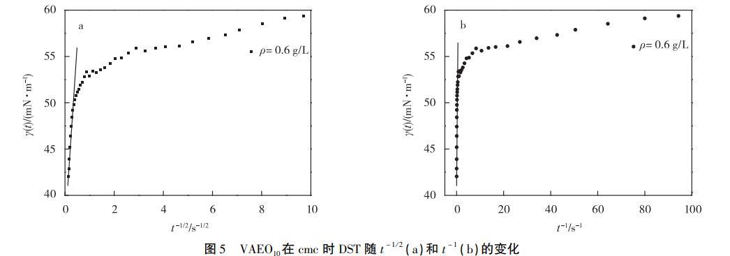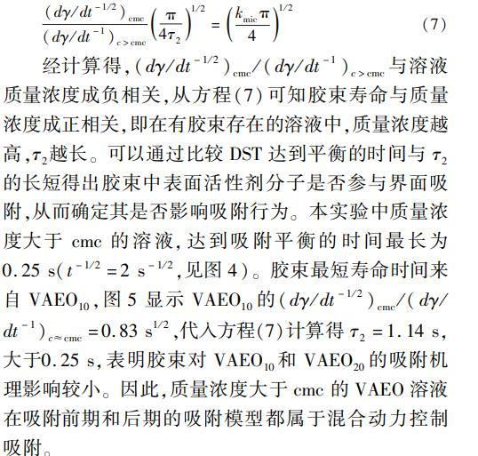 經(jīng)計(jì)算得,(dγ/dt-1/2)cmc/(dγ/dt-1)c>cmc與溶液質(zhì)量濃度成負(fù)相關(guān),從方程(7)可知膠束壽命與質(zhì)量濃度成正相關(guān),即在有膠束存在的溶液中,質(zhì)量濃度越高,τ2越長(zhǎng)。可以通過(guò)比較DST達(dá)到平衡的時(shí)間與τ2的長(zhǎng)短得出膠束中表面活性劑分子是否參與界面吸附,從而確定其是否影響吸附行為。本實(shí)驗(yàn)中質(zhì)量濃度大于cmc的溶液,達(dá)到吸附平衡的時(shí)間最長(zhǎng)為0.25s(t-1/2=2s-1/2,見(jiàn)圖4)。膠束最短壽命時(shí)間來(lái)自VAEO10,圖5顯示VAEO10的(dγ/dt-1/2)cmc/(dγ/dt-1)c≈cmc=0.83s1/2,代入方程(7)計(jì)算得τ2=1.14s,大于0.25s,表明膠束對(duì)VAEO10和VAEO20的吸附機(jī)理影響較小。因此,質(zhì)量濃度大于cmc的VAEO溶液在吸附前期和后期的吸附模型都屬于混合動(dòng)力控制吸附。