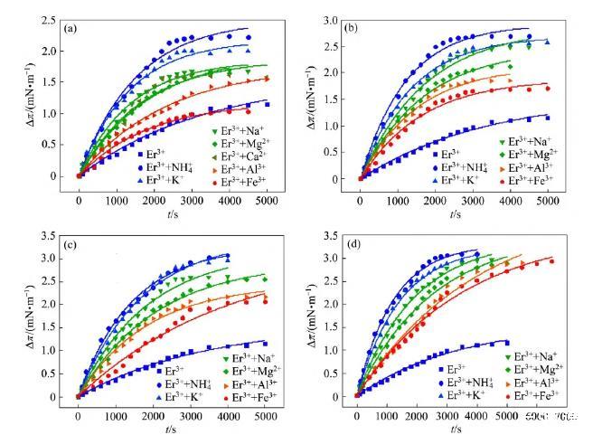 圖1為鉺離子與不同鹽陽(yáng)離子的二元混合水溶液表面P507單分子膜的Δπ?t曲線。