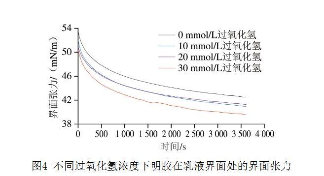 兩親性蛋白質(zhì)促進(jìn)蛋白質(zhì)吸附到油-水界面并降低油相和水相之間的界面張力,從而形成穩(wěn)定的界面層。如圖4所示,氧化組的明膠界面張力均低于對照組,這表明所有明膠樣品均具有表面活性。明膠在油-水界面處的界面張力隨著過氧化氫濃度的增加而降低。不同過氧化氫濃度下明膠的界面張力隨時間的延長逐漸降低,從未氧化組的53.8 mN/m下降到30 mmol/L組的50.7 mN/m。界面張力隨著吸附時間的延長而降低,下降速率逐漸減小,這反映了蛋白質(zhì)在界面上的吸附和覆蓋。明膠界面張力的下降與其更好的兩親性有關(guān)。因此,在本研究中氧化導(dǎo)致明膠水接觸角的增加,提高了明膠的疏水性并改善了明膠的兩親性,增加了蛋白質(zhì)向油-水界面的吸附,這可能引起油-水界面張力的下降。Feng Xin等支持這一觀點(diǎn)并報道,在豬皮明膠的提取過程中提高提取溫度也會引起界面張力的降低,并認(rèn)為隨著提取溫度的升高會破壞明膠原有的三螺旋結(jié)構(gòu),從而暴露出更多的疏水基團(tuán),這促使明膠分子能夠更快地吸附到油-水界面上,從而更大程度地降低界面張力。