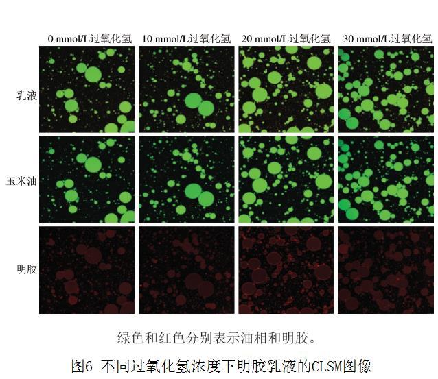 如圖5所示,明膠乳液的Zeta電位隨過氧化氫濃度的增加而降低,對照組為9.61 mV,隨著過氧化氫濃度增加至30 mmol/L,Zeta電位降低至5.94 mV,降低40%。乳液液滴Zeta電位的降低也表現(xiàn)出液滴間較小的靜電斥力。據(jù)報道,靜電和空間穩(wěn)定是蛋白質(zhì)乳液液滴穩(wěn)定的重要機(jī)制。在本研究中,氧化明膠乳液ESI下降可能也與乳液液滴間靜電斥力的下降有關(guān)。Yang Yaqin等通過探究pH值對蛋黃、蛋白乳化能力的影響支持這一觀點(diǎn),發(fā)現(xiàn)當(dāng)溶液的pH值接近蛋白質(zhì)的等電點(diǎn)時,乳液液滴之間的靜電斥力會降低,從而加劇油滴的聚集。然而,也有研究表明,虎河豚皮明膠的乳化性能也容易受到pH值的影響。該研究發(fā)現(xiàn),對于pH 6的虎河豚皮明膠,明膠分子之間強(qiáng)靜電斥力可能會抑制蛋白質(zhì)去折疊并阻礙蛋白質(zhì)分子轉(zhuǎn)移到界面上,從而導(dǎo)致虎河豚皮明膠的EAI較低。而當(dāng)虎河豚皮明膠pH值為8時,明膠分子之間較弱的靜電斥力可以促進(jìn)蛋白質(zhì)分子的去折疊并促進(jìn)其向界面的遷移,從而提高EAI。此外,該研究表明,蛋白質(zhì)分子間較強(qiáng)的靜電斥力還會破壞界面膜的穩(wěn)定性,導(dǎo)致ESI降低。