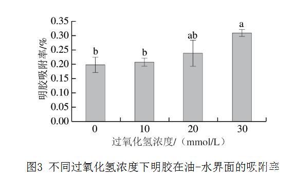 如圖3所示,乳液中油-水界面的明膠吸附率隨著過氧化氫濃度的增加而增加,從對照組的19.8%增加到30 mmol/L過氧化氫組的30.9%,增加1 倍左右,這表明更多氧化明膠分子吸附到油-水界面。Chen Jiahui等對肌原纖維蛋白進(jìn)行超聲處理,發(fā)現(xiàn)超聲處理改變了肌原纖維蛋白的結(jié)構(gòu),從而有利于形成尺寸更小、更靈活的聚集體,促進(jìn)蛋白質(zhì)在油-水界面的吸附,減少油-水界面的界面張力。在米糠蛋白的氧化中也觀察到類似的現(xiàn)象。氧化導(dǎo)致米糠蛋白中暴露出更多的疏水基團(tuán),促進(jìn)了蛋白質(zhì)在油-水界面的吸附,形成黏彈性膜,降低界面張力,使液滴分裂成更小的尺寸。相似地,Zou Heinan等利用高強(qiáng)度超聲處理減小了貽貝肌漿蛋白的尺寸并增強(qiáng)了其表面疏水性,從而增加了蛋白質(zhì)在油-水界面的吸附。