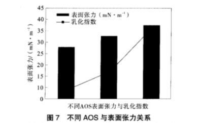 通過數據統(tǒng)計看出,AOS表面張力與乳化指數的關系則如圖7所示。
