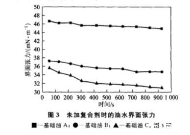 由圖3可以看出:未加復(fù)合劑時(shí),基礎(chǔ)油A的界面張力最大,基礎(chǔ)油B的界面張力次之,基礎(chǔ)油C的界面張力最??;隨著時(shí)間的延長,不同基礎(chǔ)油的界面張力均逐漸降低,基礎(chǔ)油中芳烴和膠質(zhì)等極性組分含量越大,界面張力越低,最后達(dá)到一個(gè)平衡值。這是因?yàn)椋S著時(shí)間的延長,基礎(chǔ)油中的活性物質(zhì)逐漸吸附到油水界面上,導(dǎo)致界面張力逐漸下降,最終達(dá)到吸附與脫附的動態(tài)平衡,界面張力基本不變。從圖3還可以看出,隨著基礎(chǔ)油中極性組分含量的增大,界面張力達(dá)到平衡值的時(shí)間增加。這可以解釋為基礎(chǔ)油的極性組分含量越大,在組分分子的擴(kuò)散交換速率差異較小的情況下,達(dá)到吸附-脫附平衡的時(shí)間越長。