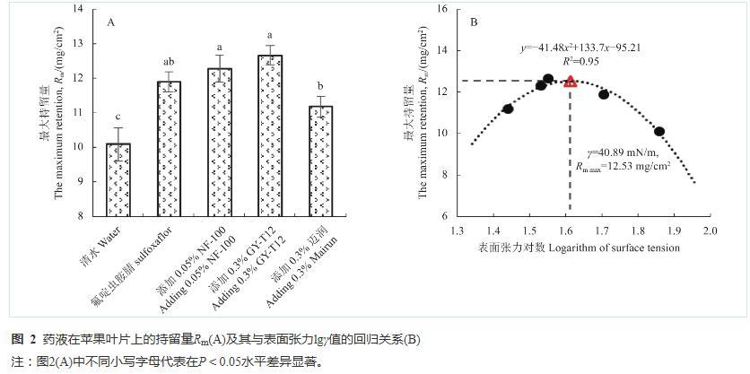 為探索藥液表面張力與藥液在蘋果葉片表面最大持留量的關系,將各處理藥液表面張力(γ)取l g值后與對應的最大持留量Rm作圖并進行了回歸分析,如圖2-B??梢钥闯觯篟m隨著γ增大呈現(xiàn)出先增大后迅速降低的趨勢,二者之間存在拋物線狀函數(shù)關系,滿足二次多項式y(tǒng)=?41.48x2+133.7x?95.21,R2為0.95。根據(jù)曲線預測,當藥液γ為40.89 mN/m時,藥液在蘋果葉片上最大持留量Rm達最大值12.53 mg/cm2。該結果可應用于成熟“富士”蘋果園,在果實膨大后期病蟲害化學防治中,可利用助劑調(diào)控藥液的表面張力使藥液達到最大持留。