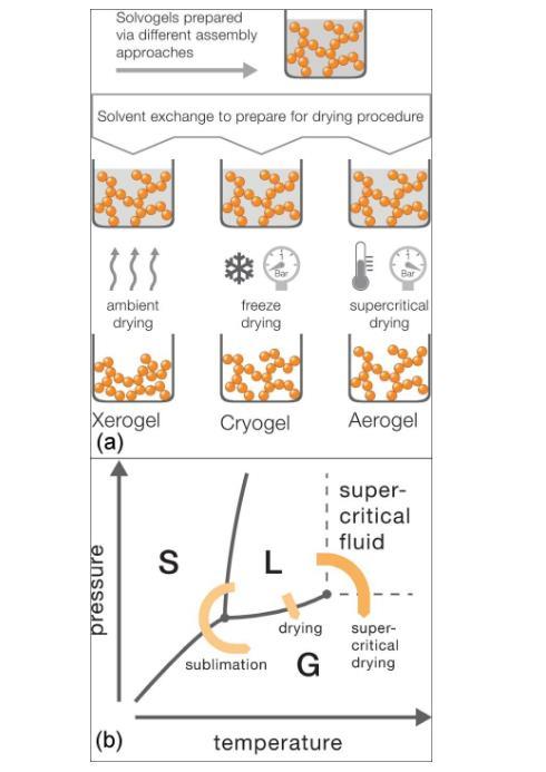 雖然三者的前體濕凝膠一樣,但得到的產(chǎn)物完全不同,原因在于凝膠中液體轉(zhuǎn)變?yōu)闅怏w經(jīng)歷了三種不同的過(guò)程,如圖5(b)所示,液體轉(zhuǎn)變?yōu)闅怏w主要有三條途徑,一為直接汽化,即常壓干燥,此時(shí)液~固界面產(chǎn)生巨大的界面張力導(dǎo)致凝膠骨架的破壞、凝膠開(kāi)裂、以及凝膠體積的巨大收縮而得到干膠;二為先凝固轉(zhuǎn)變?yōu)楣虘B(tài),再?gòu)墓虘B(tài)升華為氣態(tài),此過(guò)程即冷凍干燥,能夠消除干燥過(guò)程中液~固界面的巨大張力,但此方法由于冰晶的生長(zhǎng)造成凝膠網(wǎng)絡(luò)的破壞;三為液體轉(zhuǎn)為超臨界狀態(tài),再轉(zhuǎn)變?yōu)闅鈶B(tài),即超臨界流體干燥,此方法能夠有效避免界面張力,同時(shí)將對(duì)凝膠網(wǎng)絡(luò)的影響降低至幾乎可忽略的程度,得到的產(chǎn)物即為氣凝膠。下文詳細(xì)介紹各種氣凝膠的干燥方法。