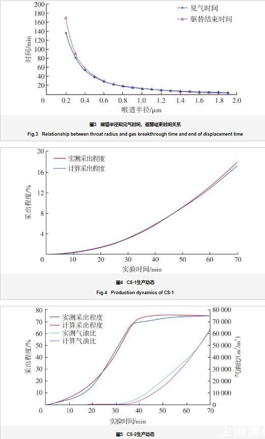 以時(shí)間為節(jié)點(diǎn),運(yùn)用節(jié)點(diǎn)分析法計(jì)算任一驅(qū)替時(shí)刻前緣位置以及見氣時(shí)間和驅(qū)替結(jié)束時(shí)間(圖3)。選擇時(shí)間步長為2 s,從驅(qū)替開始起算,在2 s的時(shí)間里部分CO2開始進(jìn)入喉道內(nèi)部的同時(shí)導(dǎo)致驅(qū)替壓差發(fā)生變化,進(jìn)一步導(dǎo)致CO2-原油體系的界面張力以及原油黏度發(fā)生改變。因此,將驅(qū)替進(jìn)行2 s后的實(shí)際驅(qū)替壓差以及對(duì)應(yīng)的界面張力、黏度等參數(shù)代入第2個(gè)時(shí)間步參與計(jì)算,依次迭代,直至CO2驅(qū)過程結(jié)束。運(yùn)用該方法,結(jié)合喉道大小及分布頻率特征計(jì)算得到C8-1和C8-2巖心并聯(lián)CO2驅(qū)替全過程生產(chǎn)動(dòng)態(tài)(圖4、圖5)。由圖3可知:見氣時(shí)間與驅(qū)替結(jié)束時(shí)間隨喉道半徑的增大而縮短,且喉道越大縮短幅度越小。喉道半徑越大,驅(qū)替結(jié)束時(shí)間與見氣時(shí)間的差值越小,可以推斷物性較好的油藏見氣后氣油比上升較快。