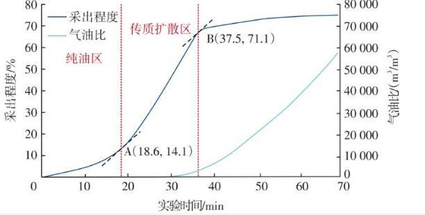 總結(jié)以上分析認(rèn)為,CO2驅(qū)生產(chǎn)動(dòng)態(tài)規(guī)律為:在CO2驅(qū)替前緣未達(dá)到井口前采出端為純油流,此階段CO2-原油體系作用時(shí)間短,溶解降黏、萃取等作用效果不明顯,因此采油速度小、單井產(chǎn)量低且油井不見氣,如圖6中的純油區(qū),該區(qū)域主要依靠CO2驅(qū)動(dòng)力采油,采出程度曲線呈緩慢上升驅(qū)勢(shì)。隨著開發(fā)推進(jìn),CO2-原油體系作用時(shí)間增加,溶解降黏、萃取等作用逐漸占據(jù)主要作用,原油黏度減小,此時(shí)油井開始緩慢見氣。如圖6中的傳質(zhì)擴(kuò)散區(qū),油井產(chǎn)量增加,采油速度加快,采出程度曲線快速上升。在純油區(qū)向傳質(zhì)擴(kuò)散區(qū)過渡階段,采出程度曲線上存在一切點(diǎn)(圖6中A點(diǎn)),其對(duì)應(yīng)的時(shí)間18.6 min為見氣時(shí)間,對(duì)應(yīng)的采出程度14.1%為純油區(qū)推進(jìn)至井口時(shí)的采出程度。隨著CO2驅(qū)的持續(xù)進(jìn)行,傳質(zhì)擴(kuò)散區(qū)大部分已經(jīng)推進(jìn)至采油井附近,油井產(chǎn)氣量迅速增大的同時(shí)產(chǎn)油量迅速減小,采出程度緩慢增加直至穩(wěn)定。在傳質(zhì)擴(kuò)散區(qū)采出的末段,采出程度曲線上存在一切點(diǎn)(圖6中B點(diǎn)),該點(diǎn)所對(duì)應(yīng)的時(shí)間37.5 min近似為驅(qū)油結(jié)束時(shí)間,此時(shí)對(duì)應(yīng)的采出程度71.1%為傳質(zhì)擴(kuò)散區(qū)推進(jìn)至井口時(shí)的采出程度。此后氣油比迅速增大,CO2驅(qū)油進(jìn)入末期。