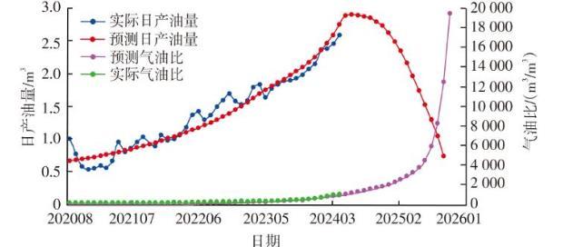 運(yùn)用主流喉道半徑和滲透率之間的關(guān)系將滲透率換算為主流喉道半徑用于計(jì)算,滲透率由研究區(qū)三維地質(zhì)模型獲得。圖7為Y30-101井計(jì)算得到日產(chǎn)油量、氣油比和實(shí)際生產(chǎn)數(shù)據(jù),對(duì)比發(fā)現(xiàn)整體趨勢(shì)較為吻合。按照目前開發(fā)制度,預(yù)計(jì)2024年8月日產(chǎn)油量達(dá)到2.86 m3,氣油比達(dá)到907 m3/m3,隨后日產(chǎn)油量急劇降低,氣油比快速增加,開發(fā)人員可及時(shí)調(diào)整生產(chǎn)制度避免油井過早見氣。
