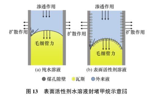 毛細(xì)管力與溶液表面張力成正比、與孔隙半徑成反比;同時(shí),接觸角越小,毛細(xì)管力越大。由表5可知,朱鍇[21]試驗(yàn)并計(jì)算煤樣10 nm孔徑的毛細(xì)力,發(fā)現(xiàn)自配的表面活性劑水溶液能夠使毛細(xì)力平均提高2倍,最大提高4.03倍。如圖13所示,在擴(kuò)散、滲透和毛細(xì)力共同作用下,表面活性劑水溶液沿著煤體表面、孔隙和裂隙進(jìn)入煤體內(nèi)部產(chǎn)生液相滯留效應(yīng),增大煤潤濕效果的同時(shí)其內(nèi)部瓦斯流動(dòng)阻力變大,孔隙內(nèi)瓦斯氣體被水溶液封堵。因此,添加活性劑水溶液能夠減小水溶液的表面張力、降低水溶液與煤之間的接觸角,增強(qiáng)煤的潤濕效果,達(dá)到抑制煤層瓦斯的解吸、延緩采動(dòng)煤巖體中瓦斯逸散的目的,從而降低開采工作面瞬時(shí)瓦斯涌出量。也有學(xué)者[21,29,32]分析認(rèn)為,添加表面活性劑水溶液會(huì)降低煤體溫度、增強(qiáng)煤吸附瓦斯的能力,使得部分游離態(tài)瓦斯轉(zhuǎn)變?yōu)槲綉B(tài),相應(yīng)地減少了瓦斯氣體的逸散涌出。
