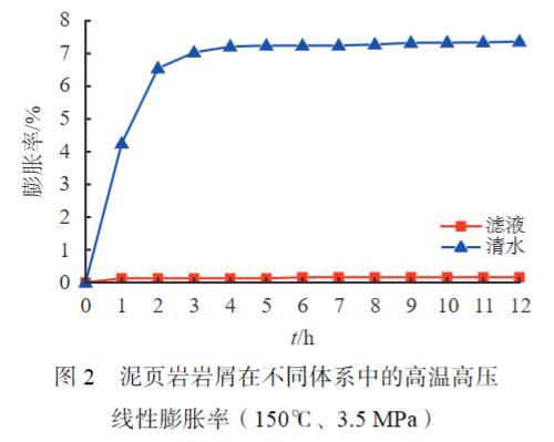 此外,目標(biāo)區(qū)塊儲(chǔ)層段巖屑的線(xiàn)性膨脹率實(shí)驗(yàn)結(jié)果如圖2所示。結(jié)果顯示,巖屑在清水中浸泡12 h的線(xiàn)性膨脹率為7.32%,在抗超高溫低滲透儲(chǔ)層鉆開(kāi)液中浸泡的線(xiàn)性膨脹率為0.15%,表明該鉆開(kāi)液體系抑制地層巖石水化膨脹性能效果好,有利于減少井壁巖石水化,穩(wěn)定井壁和保障井筒安全。