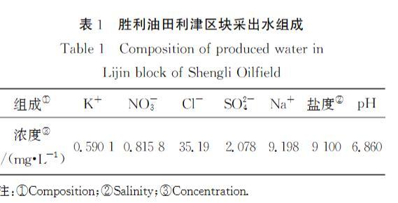 實(shí)驗(yàn)試劑:葡萄糖、檸檬酸鈉、酵母粉、KH2PO4、(NH4)2SO4、MgSO4·7H2O、乙酸乙酯為分析純,購(gòu)自國(guó)藥集團(tuán)化學(xué)試劑有限公司;正己烷為優(yōu)級(jí)純,購(gòu)自Merck公司;二氯甲烷為優(yōu)級(jí)純,購(gòu)自B&J公司;正構(gòu)烷烴混合標(biāo)準(zhǔn):C8—C40包含異構(gòu)烷烴姥鮫烷和植烷,購(gòu)自Accustandard公司;層析硅膠(100~200目)及硅膠層析板購(gòu)自青島海洋化工廠(chǎng);原油采集自中國(guó)石化勝利油田有限公司利津區(qū)塊;降解實(shí)驗(yàn)用水根據(jù)勝利油田利津區(qū)塊采出水組成配置(見(jiàn)表1),采出水中pH、鹽度用多參數(shù)儀(Manta3.0,Eureka,美國(guó))測(cè)定,K+、NO-3、Cl-、SO2-4、Na+等離子依據(jù)SY/T5523—2016《油田水分析方法》中給出的檢測(cè)方法檢測(cè)。