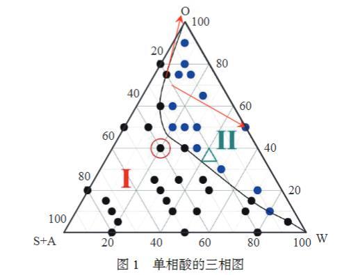通過擬三元相圖制備單相酸相圖,根據(jù)油相(O)、酸相(W)、表面活性劑(S)+助表面活性劑(A)的比例進行三相圖的繪制。室溫下,固定油相(O)的加量,固定非離子表面活性劑(S1)與陽離子表面活性劑(S2)的質量比,固定表面活性劑(S,S=S1+S2)與助表面活性劑(A)的質量比。將不同比例下的液體進行離心,然后進行觀測,觀察體系由澄清透明(一相)變?yōu)榛鞚幔ǘ啵┑南嘧冞^程,在每次發(fā)生相變的同時記錄所滴加鹽酸的量,以O、S+A、W為三相,繪制擬三元相圖,見圖1。由圖1可知,在圖1的紅圈標記區(qū)域,配方的經(jīng)濟性最好,是維持單相區(qū)域最小的表面活性劑用量(S+A),且該配方下的單相酸遇水遇油后仍可在較大范圍內保持單相。