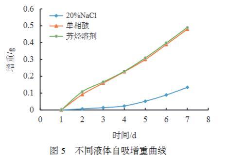 設置不同液體進行自吸實驗,對比親油巖心對于不同液體的自吸能力,實驗結果見圖5。對孔隙介質而言,潤濕性控制兩相或多相流體的分布和流動。平衡時濕潤相與孔隙表面相互接觸,而非濕相占據(jù)孔隙的中央位置,介質中發(fā)生兩相或多相流動時,毛管力與濕相流動方向一致,是非濕相自發(fā)進入巖心介質驅替潤濕相的阻力,對于油濕巖心介質,很難發(fā)生水的自吸。從實驗結果可以看出,單相酸自吸效果和芳烴溶劑十分接近。