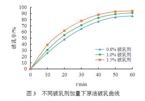 將單相酸與原油高速攪拌混合制備乳狀液,油水比3∶2。分別加入0.8%、1.0%、1.5%二酸二辛脂磺酸鈉破乳劑,水浴90℃,靜態(tài)放置,每隔10 min測量析出量,計算破乳率,實驗結果見圖3。加入1%破乳劑后,單相酸破乳率在1 h內可達到90%以上。