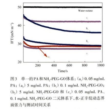 在25℃條件下,測得水和正辛烷之間的界面張力為50.7 mN/m(圖3),與之前研究中報道的界面張力值51.16 mN/m非常接近。為了研究PA與NH2-PEG-GO在共存時對界面張力的影響,分析了0.05 mg/mL PA、0.1 mg/mL NH2-PEG-GO各自對界面張力的影響。圖3顯示PA與NH2-PEG-GO均具有界面活性,能夠吸附到水-正辛烷界面上,降低界面張力。同時也觀察到:0.05 mg/mL PA降低界面張力速率快,平衡時間較短(<200 s),界面張力曲線呈現(xiàn)先快速下降后平衡的趨勢,而當(dāng)0.1 mg/mL NH2-PEG-GO存在于溶液中時,界面張力降低速率較慢,大約在700 s后達(dá)到平衡。分析發(fā)現(xiàn),界面張力隨著時間的演變呈現(xiàn)先快速下降,后緩慢下降,最后平衡的特點(diǎn),這表明接近吸附平衡時出現(xiàn)勢壘,減緩了粒子在界面上的進(jìn)一步吸附。這種吸附勢壘由多種因素導(dǎo)致,通常與已吸附在界面上的分子所產(chǎn)生的表面壓以及隨著界面密度提高,分子取向的改變相關(guān)。同時在吸附后期,可供吸附的界面面積減少,已經(jīng)吸附到界面上的粒子必須重新排列以空出足夠的空間供額外的粒子進(jìn)行吸附。這種重排的速率是由粒子的面內(nèi)遷移率決定的,即粒子在界面上的擴(kuò)散系數(shù)。該擴(kuò)散系數(shù)通常要小于粒子在本體中的擴(kuò)散系數(shù),并與粒子尺寸、粒子表面配體修飾等相關(guān)。