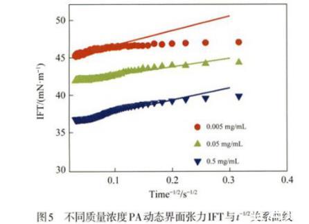 圖5不同質量濃度PA動態(tài)界面張力IFT與t-1/2關系曲線