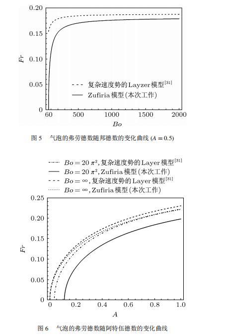 圖6將Layzer模型和Zufiria模型進行了比較??梢钥闯?,在理想流體情況下,Zufiria模型所計算的氣泡的漸近速度小于Layzer模型;在考慮界面張力的情況下,Zufiria模型的結(jié)果仍然小于Layzer模型的結(jié)果。這一結(jié)論和Sohn所得結(jié)果一致。