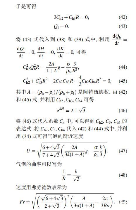 將具有簡單速度勢的Layzer模型和Zufiria模型推廣至非理想流體情況,并分別利用這兩種模型研究了界面張力對Rayleigh-Taylor不穩(wěn)定性的影響。首先得到了兩種模型下氣泡的漸近速度和漸近曲率的解析表達式;其次系統(tǒng)研究了界面張力對氣泡的漸近速度和漸近曲率的影響;最后將兩種模型進行了比較,并將氣泡的漸近速度和數(shù)值模擬進行了比較。研究表明:界面張力壓低了氣泡的速度,但對曲率沒有影響;利用簡單速度勢的Layzer模型所得的氣泡的漸近速度比復雜速度勢的Layzer模型的值小,但是比Zufiria模型的值大;當阿特伍德數(shù)等于1時,簡單速度勢的Layzer模型和復雜速度勢的Layzer模型給出的結(jié)果一致。