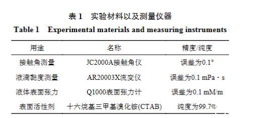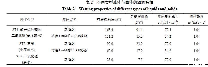 由于固、液兩相的表面特性會(huì)顯著影響固?液接觸角,從而影響液滴與顆粒的碰撞行為,筆者通過實(shí)驗(yàn)測量和文獻(xiàn)分析,對比了固、液特性的變化對接觸角的影響。表1列出了測量固、液特性時(shí)所使用的具體儀器及添加劑。表2給出了不同固體和液體樣品的接觸角、表面張力和黏度。其中高度疏水固體ST1與不同液體接觸角通過實(shí)測得出,中度疏水固體ST2和親水固體ST3的測量數(shù)據(jù)來自ZHU等的研究。對比后發(fā)現(xiàn),前進(jìn)接觸角α明顯大于后退接觸角β,所以在分析塵?霧濕潤特性時(shí)應(yīng)考慮前進(jìn)角和后退角的差異。