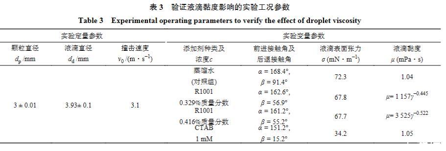 因此,碰撞速度v0設(shè)為3 m/s,液滴直徑dd設(shè)為4 mm。v0的大小通過液滴顆粒之間的豎直高度來設(shè)定,具體計(jì)算式為v0=√ ̄2gH,其中g(shù)為重力加速度,H為豎直高度,數(shù)值為40 cm。由于實(shí)驗(yàn)誤差,v0測量值為3.1 m/s,dd測量值為3.93±0.1 mm。詳細(xì)的條件參數(shù)設(shè)置見表3。使用高速攝像機(jī)記錄樣品顆粒上剩余的附著液體量。