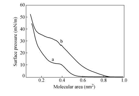 2種單體分子結(jié)構(gòu)相似,CO2DA比CODA多了一CH?-CH?O一柔性間隔基,整個(gè)分子的舒展程度相對(duì)較大。當(dāng)CODA分子在水面鋪展時(shí),與水分子的相互作用小,分子"平躺"在水面上,當(dāng)膜障壓縮單分子膜時(shí),CODA分子受到側(cè)向壓力時(shí)容易發(fā)生滑移,形成多層膜。而CO2DA分子端基親水性相對(duì)較強(qiáng),當(dāng)膜障壓縮單分子膜時(shí)分子在水面能立起來,并與液面形成一定的夾角。因此CO2DA單分子膜占據(jù)面積較大,崩潰壓較高。