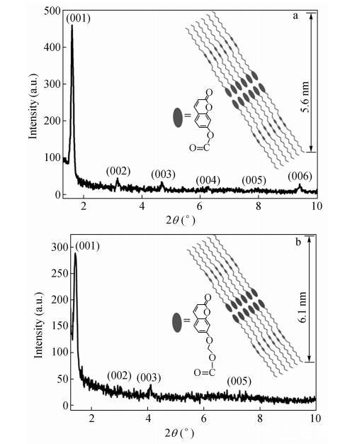 在2θ=2°~10°范圍內(nèi)出現(xiàn)的多個(gè)等距離Bragg衍射峰表明得到的CODA和CO2DA LB膜具有很好的周期性結(jié)構(gòu)。假定從左至右Bragg衍射峰依次為(001),(002),...,(006),用Bragg方程對(duì)各級(jí)衍射峰進(jìn)行計(jì)算可得CODA和CO2DA LB膜層狀結(jié)構(gòu)間距為5.6nm和6.1nm。CO2DA LB膜的Bragg衍射峰較寬,強(qiáng)度較弱,Bragg衍射峰隨角度的增大衰減很快,說明CO2DA LB膜中分子排列較CODA LB膜中松散,存在局部的缺陷。理論計(jì)算充分展開的CODA和CO2DA分子鏈長約為3.5nm和3.6nm,所以觀察到的周期結(jié)構(gòu)包含雙層的CODA和CO2DA分子。我們可以預(yù)想雙層結(jié)構(gòu)的中間區(qū)域是香豆素基團(tuán)經(jīng)過強(qiáng)烈的π-π堆積作用形成的,而雙層結(jié)構(gòu)單元的外部為烷基側(cè)鏈。香豆素取代二乙炔單體的規(guī)則排列是二乙炔單元進(jìn)行拓?fù)渚酆系南葲Q條件。