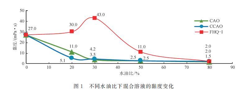 將CAO、CCAO和FHQ-I分別與現(xiàn)場(chǎng)采集的黏度約為27mPa·s的原油進(jìn)行混合,配置成200ml混合溶液,用六速旋轉(zhuǎn)黏度計(jì)在200r/min的條件下,對(duì)水油比分別為20%、30%、50%和80%的混合溶液的黏度進(jìn)行測(cè)量,結(jié)果如表3和圖1所示。