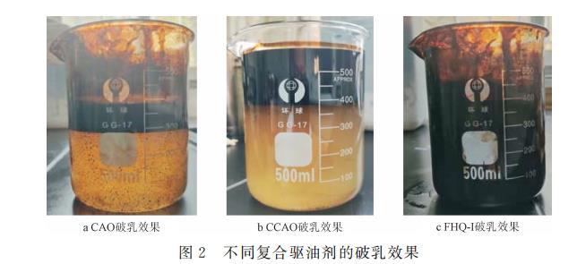取一定量的CAO、CCAO或FHQ-I以及約35%的原油分別和65%的模擬地層水置于500ml燒杯中,將燒杯放入30℃六速攪拌器中,以200r/min的速度恒溫?cái)嚢?0min,使其完全乳化,破乳效果如圖2所示。