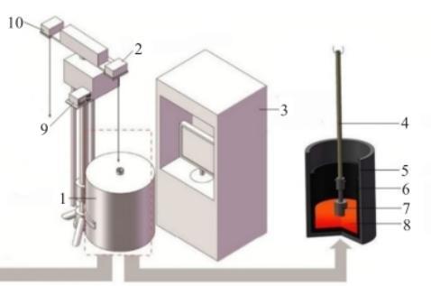 1.高溫爐;2.黏度儀;3.控制箱;4.剛玉套管;5.碳化硅坩堝;6.石墨坩堝;7.鎢制測頭;8.熔鹽;9.導(dǎo)電儀;10.天平儀。