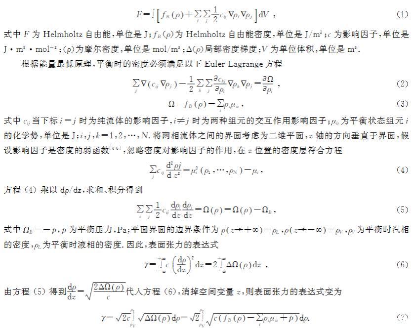 vanderWaals首先提出了密度梯度理論,并將該理論用于氣液界面,通過(guò)對(duì)氣液界面的研究得出結(jié)論,界面處的密度變化是連續(xù)的,后來(lái)該理論被Cahn和Hilliard完善。該理論中,界面的Helmholtz自由能密度為兩部分的加和:均相部分和非均相部分。Helmholtz自由能密度Taylor級(jí)數(shù)的二階展開式為