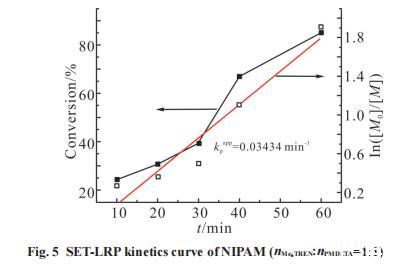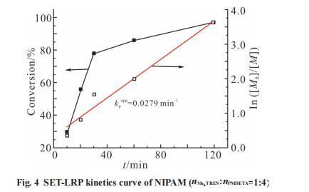 從Fig.4可以看出,當(dāng)混合配體n(Me6TREN):n(PMDETA)=4:1時,轉(zhuǎn)化率隨反應(yīng)時間延長而增大,反應(yīng)時間為2h時,轉(zhuǎn)化率達(dá)到95%。